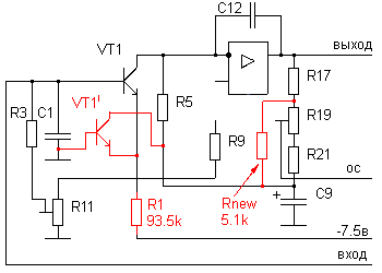 Идея доработки Основная идея доработки - замена входного каскада, собраного по схеме с общим эмиттером, на дифференциальный каскад. Сопротивление R1 уменьшено для сохранения режима по постоянному току транзисторов. Дополнительный резистор Rnew установлен для увеличения коэффициента усиления каскада на ОУ, так как коэффициент усиления входного каскада становится меньше. Регулировка канала воспроизведения Для подстройки канала воспроизведения после данной доработки УВ необходима кассета с записанной синусоидой 400-1000 Гц и уровнем около 0 db. Перед доработкой УВ, воспроизведите эту кассету, и измерьте амплитуду напряжения на линейном выходе или запомните положение индикаторов уровня на магнитофоне. После доработки выставите с помощью подстроечных резисторов R19 (R20) прежние значения амплитуды напряжения на линейном выходе или положение индикаторов уровня на магнитофоне. Подстройка ВЧ коррекции не требуется. Хотя при такой схеме коррекции, оптимальное положение, с позиции качества звучания, в минимуме верхних частот, так как при этом отсутствует положительная обратная связь. Более подробно можно ознакомиться с методикой регулировки канала записи/воспроизведения магнитофона ВЕГА МП122С здесь. |