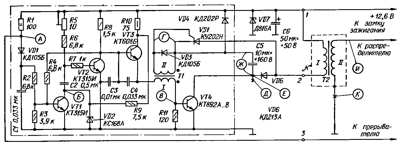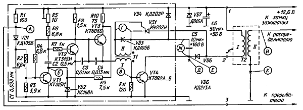 Для экономии бензина и уменьшения вредных продуктов сгорания в последнее время наметилась тенденция обеднять горючую смесь в двигателях автомобилей. Для надежного воспламенения обедненной смеси требуется мощный и длительный искровой разряд. Установлено, что такой разряд, кроме этого, допускает больший разброс угла опережения зажигания, уменьшает детонацию, улучшает пуск и повышает устойчивость работы двигателя на любых режимах. Формирование запальных искровых разрядов в последние годы все чаще доверяют электронным системам зажигания, преимущества которых широко известны. Описываемый ниже блок объединяет в себе свойства транзисторной и тринисторной систем зажигания. От первой он отличается тем, что в нем использован закрытый (при замкнутых контактах прерывателя) транзисторный ключ, коммутирующий цепь первичной обмотки катушки зажигания, а от второй - тем, что накопительный конденсатор заряжается от ЭДС самоиндукции этой же обмотки, когда транзисторный ключ прерывает ток через нее [1]. От известных систем зажигания с импульсным накоплением энергии на конденсаторе [2] и от комбинированных систем [3, 4] она отличается отсутствием специального многообмоточного накопительного трансформатора. Система обеспечивает искровой разряд более высокой длительности и энергии. По этим параметрам она превосходит известные системы зажигания. Так, по длительности разряда устройство в 8... 10 раз превосходит тринисторно-конденсаторные системы с непрерывным и импульсным накоплением энергии. При неработающем двигателе она потребляет незначительный ток, имеет высоную скорость нарастания высоковольтного импульса и при всех значениях частоты вращения коленчатого вала двигателя формирует на один запускающий импульс мощный двойной искровой разряд. Система защищена от дребезга контактов прерывателя и от помех бортовой сети автомобиля. Недостатком системы зажигания является обязательность использования в ней катушки зажигания с малой индуктивностью первичной обмотки и высоким коэффициентом трансформации (около 300). Удовлетворительно работает система с катушкой Б114 (коэффициент трансформации 227). Но для полной реализации возможностей системы катушку надо несколько переделать, чтобы довести коэффициент трансформации до 280. После переделки можно использовать и широко распространенные катушки Б115, Б117 О самой переделке рассказано в конце статьи. Основные технические характеристики