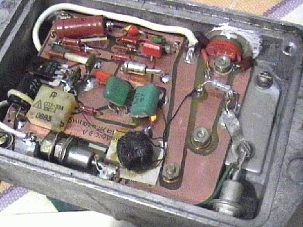 Чертеж печатной платы, которая изготовлена из фольгированного стеклотекстолита толщиной 2 мм, показан на рисунке. Диод VD6 для улучшения его охлаждения установлен на дюралюминиевом уголке и изолирован слюдяной прокладкой. Соединительные проводники между коллектором транзистора VT4, диодом VD6 и зажимом 2 блока должны иметь минимальную длику и сечение не менее 0,75 мм2. Разделительный трансформатор Т1 наматывают на кольцевом магнито проводе типоразмера К12Х6Х4 из феррита с магнитной проницаемостью 1000—2000. Можно применить магнитопровод другого типоразмера, например, K12X5X5,5 или из двух колец K10Х Х6Х4.5. Обмотки содержат по 70 витков провода ПЭЛШО 0,15. Наматывают их одновременно двумя проводами. Конденсаторы С1, СЗ, С4 — К10-7В или КЛС; С2 — К73П-3; С5 — МБГО; Сб — К50-3, его можно заменить малогабаритным К52-2 емкостью 15 мкФ на номинальное напряжение 70 В. Диод КД202Р можно заменить на КД202М, КД202К, Д245А - на Д231А, Д232, Д246А; тринистор КУ202Н — на КУ202Л, КУ202И; стабилитрон КС168А — на КС168В, КС162А, КС156А; КС630А — на 2С930А. Транзисторы КТ315И можно заменить на КТ315В. КТ315Г, КТ503 с любым буквенным индексом; КТ608Б — на КТ608А, КТ815Б — КТ815Г; КТ805АМ — на КТ805БМ; 1Т813В — на 1Т813Б, 1Т806В, ГТ806В. Общий вид блока (со снятой крышкой) и размещение деталей в нем показаны на рисунке.