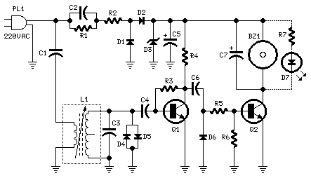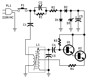 Транзисторы Q1,Q2 соединены по схеме Дарлингтона образуя генератор Хартли с высокой амплитудой выходного ВЧ сигнала. Напряжение 220V понижается до 30V без использования трансформатора за счет использования конденсатора C1 как реактивное гасящее сопротивление. На диодах D1 и D2 собран выпрямитель, а на D3 стабилизатор напряжения. Выходное ВЧ напряжение генератора частотой 135 кГц через катушку связи трансформатора L1 через разделительный конденсатор C1 поступает в электрическую сеть переменного тока.