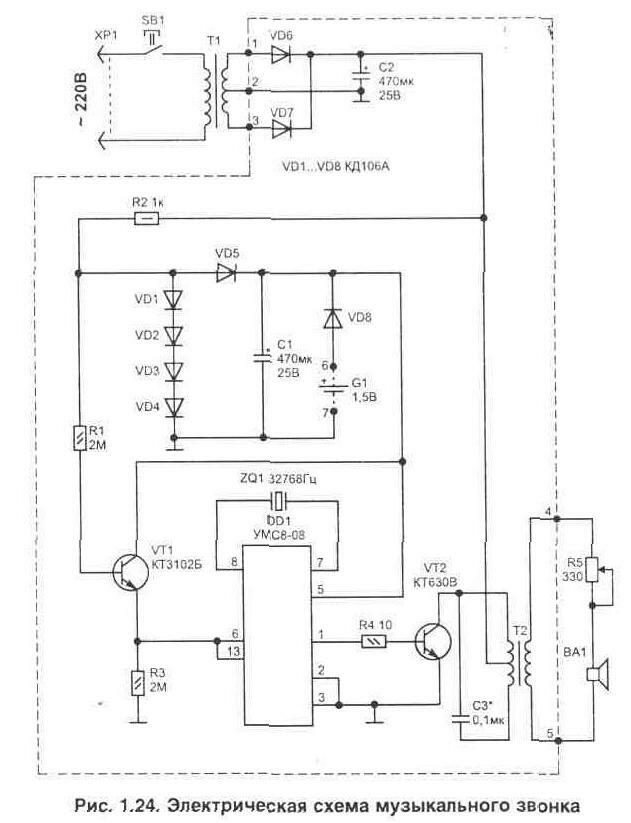 Музыкальный звонок с автоматической сменой мелодииВо многих квартирах для вызова хозяина используется музыкальный звонок. Такое устройство не сложно изготовить самостоятельно. При этом оно ничем не будет уступать выпускаемым промышленностью, но обойдется значительно дешевле. В журналах встречается немало схем музыкальных звонков, например [Л17]. Такое устройство удобно выполнять на специализированной микросхеме звукового синтезатора из серии УМС. Эти микросхемы выпускаются с несколькими запрограммированными мелодиями, которые можно переключать, подавая напряжение на вход "выбор мелодии". Принцип работы такой микросхемы подробно описан в литературе [Л 18]. В отличии от уже опубликованных вариантов музыкальных сигнализаторов, в приведенной на рис. 1.24 схеме не требуется использовать дополнительную кнопку для переключения мелодии. Смена мелодии происходит автоматически при каждом очередном нажатии на кнопку звонка (SB1). Каждая мелодия будет звучать, пока нажата кнопка. Для усиления звукового сигнала использован транзистор VT2. Резистор R5 позволяет регулировать громкость звукового сигнала в широких пределах. Согласование выходного сопротивления схемы с малым сопротивлением катушки звукового излучателя выполнено при помощи трансформатора Т2. Кроме того, применение трансформатора позволяет исключить протекание через динамик постоянной составляющей тока, что улучшает его работу. В качестве звукового излучателя ВА1 может применяться любой обычный динамик. Динамиков допускается подключать несколько и их размещаем в удобных местах квартиры.