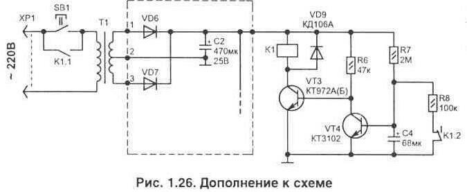 Трансформатор Т2 - выходной от любого миниатюрного транзисторного радиоприемника. Транзистор VT1 можно заменить на КТ315, а VT2 на КТ972А(Б), КТ829А. Диоды VD1...VD8 типа КД106А, но подойдут и многие другие с аналогичными параметрами. Регулировочный резистор R5 использован типа ППБ-1А, конденсаторы С1, С2 типа К50-35 на 25 В, С- - К10-17. Кварцевый резонатор ZQ1 любого типа на рабочую частоту 32768 Гц. Для того чтобы продолжительность проигрывания мелодии не зависела от того, сколько времени нажата кнопка вызова, в схему можно установить таймер, рис. 1.26. Он выполнен на двух транзисторах VT3, VT4 и реле К1. Таймер позволяет увеличить время исполнения мелодии до 6...7 с после отпускания кнопки (время зависит от номинала конденсатора С4).