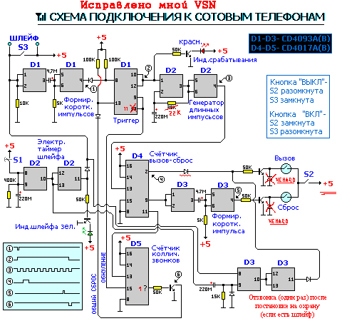 Рис. 1 Авторский вариант схемы Рис. 2 Вариант схемы с доработками от Сергея Воротникова Я рекомендую не меньше пяти т.к. телефон может терять сеть хоть один звонок но пройдёт. На выходе микросхемы D5 лог."0"переключает триггер D1 выв.13 в другое положение, тем самым отключается генератор и счётчики переходят в начальное состояние. На микросхеме D2 слева собран электронный таймер (время задержки примерно 1 мин.) При нажатии на кнопку S1 таймер принудительно коротит шлейф на 1 минуту для того, чтобы спокойно покинуть помещение. Через минуту схема переключится в режим охраны. Чтобы войти в помещение нужно как можно быстрее закоротить шлейф S3 возможно один звонок может пройти. В схеме можно сделать и дистанционное включение и выключение охраны,то придётся схему усложнить. Моя схема - упрощёный вариант. Использовать можно микросхемы 561 ИЕ8 и 561 ТЛ1 .КМОП-микросхемы более надёжны и не боятся никаких ВЧ наводок и помех. Микросхема ТЛ1 даёт идеальную прямоугольную форму сигнала и отлично работает с любыми счётчиками. Генератор собран на 2х инверторах но я рекомендую собрать на 3х инверторах- стабильность работы генератора увеличится на порядок , влияние окружающей температуры и отклонение напряж. питания + 3 вольта отклонение частоты составляет всего 0,05%.Не пытайтесь подключаться к телефону через электронные ключи ,это бестолковый труд ,в лучшем случае телефон просто зависнет. Используйте только релюшки -любые, малоточные. В схеме обязательно нужен резервный источник питания т.к. счётчики встают в правильную работу только после первого запуска. Электронная схема потребляет ток всего 3mA. Транзисторы подойдут любые,я использую КТ3102. Сотовый телефон можно использовать в своём варианте как он укомплектован: аккумулятор и постоянная подзарядка. Если на телефоне дозвон осуществляется нажетие на кнопку 2раза, то на микросхеме D4 выводы 2 и 7 соединить вместе подключить формирователь короткого импульса аналогично выводу 9 на базу тразистора и реле дозвона Комментарий автора к доработки схемы от Сергея Воротникова: Я не советую убирать диоды с транзисторов и подключать к питанию 5v. Это дополнительная нагрузка на схему. Т.к. генератор не стабилен на 2х инверторах, (указано в тексте). Вообще лучше на трёх инверторах собирать, но нет лишних выводов.
