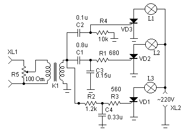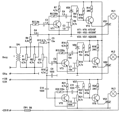 Налаживание приставки начинается с проверки питающих напряжений. Амплитуда сигнала на выходных обмотках трансформатора ТР1 должна быть около 2В. Затем настраивают фильтры каналов. Для этого лучше всего использовать генератор низкой частоты, который подключают ко входу схемы. Начинают с фильтра низких частот (верхний по схеме). Резистор R1 устанавливают в положение, соответствующее минимальному ослаблению сигнала, далее подстроечным резистором R8 регулируют полосу пропускания фильтра, чтобы обеспечивалось максимальное свечение лампы данного канала при подаче от генератора НЧ сигналов с частотами 100...800 Гц. Аналогично настраивают остальные фильтры (1000...6000 Гц, 6000...10000 Гц). При эксплуатации устройства для различных типов входных сигналов необходимо производить подстройку уровней сигнала в каналах резисторами Rl, R2. R3. Это позволяет компенсировать неравномерность частотной характеристики сигнала и обеспечить одинаковую яркость свечения ламп для всех каналов. Трансформатор ТР1 изготавливается на магнитопроводе Ш 10x10 из трансформаторной стали. Обмотка I содержит 200 витков провода ПЭЛ 0,2 , обмотка II — 400 витков ПЭЛ 0.2. Трансформаторные обмотки тщательно изолируются лакотканью. Вместо ТР1 можно применить оптрон. Вместо симисторов КУ208 можно использовать тиристоры КУ202. но при этом требуется выпрямительный мост в цепи питания ламп. Мощность ламп может быть доведена до 2 кВт на канал. В случае увеличения мощности ламп на канал до 200 Вт и более, силовые элементы (тиристоры или симисторы) необходимо устанавливать на теплоотводящие радиаторы.