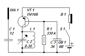 Сигнал принимается антенной WA 1, роль которой может выполнять отрезок монтажного провода. Этот сигнал поступает в колебательный контур L1C2, подстраивая конденсатор С2 контур можно перестраивать в пределах УКВ ЧМ диапазона 65.8-73 МГц. Выделенное этим контуром напряжение сигнала поступает через конденсатор С3 на базу транзистора VT1. Этот транзисторный каскад выполняет одновременно несколько функций: функции фазового детектора, фильтра нижних частот, усилителя постоянного тока и усилителя низкой частоты. Фазовое детектирование происходит на р-n переходах транзистора, эквивалентных переходам диодов. Собрать приёмник можно объёмным монтажом, или можно разработать печатную плату на основе принципиальной схемы, а детали на ней расположить в том же порядке как на схеме. Катушка L1 не имеет каркаса, для намотки берется хвостовик сверла диаметром 7 мм и на нём наматывается катушка проводом ПЭВ 0,4...0,5 мм. Катушка L1 содержит 14 витков. После намотки сверло из катушки извлекается (оно служит только в качестве оправки для намотки). Транзистор П416Б можно заменить на ГТ308А, КТ603Б. Телефон – любой высокоомный малогабаритный. Конденсатор С2 типа КПК - керамический, на 8...30p, 5...20р или 4...15р, он настраивается вращением винта, расположенного посредине. В качестве источника питания можно использовать элемент питания Крона на 9 В. Выключатель любой, например тумблер.