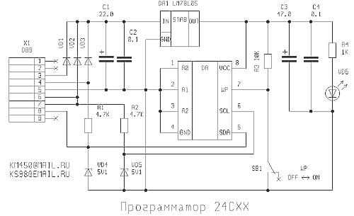 * - для этого варианта А0 (1 нога панельки DA) должна быть подключена к VCC (8 нога панельки DA). Программатор не требует отдельного питания и подключается к COM порту комппьютера. Схема программатора представлена на Рис1. Схема не представляет собой ничего особенного кроме одного момента. В качестве источника питания в авторском варианте применен стабилизатор на микросхеме LM2936Z-5. Причем специально указано что не рекомендуется ее заменять на микросхемы типа LM78L05. Стал сравнивать и выяснилось следующее. для нормальной работы микросхемы типа LM78L05 требуется входное напряжение не менее 7.5 вольт при собственном потреблении как минимум 3 ма. Это лишняя нагрузка на порт. Микросхема LM2936Z-5 входит в режим стабилизации сразу после 5 вольт при собственном потреблении порядка 10 мка. Все данные взяты из описаний на микросхемы. На сайте www.chipinfo.ru за LM2936Z-5 в зависимости от фирмы просят от 100 до 300 рублей! Мне это показалось накладным для домашнего использования и я все же применил LM78L05. У меня это не сказалось на работе программатора. Компьютер старенький, и видимо порты достаточно мощные. Конструкция и детали.Программатор собран на плате из двустороннего стеклотекстолита и имеет размеры 50*35 мм. Рис.1. Принципиальная схема (щелкните мышью для увеличения) Малые размеры позволяют подключить его непосредственно к COM порту комппьютера. так что кабель к нему паять не придется. На рис.2 указано расположение деталей. Рис.2. Расположение деталей (щелкните мышью для увеличения) Разьем Х1 типа DB9 (мама) использован мною со старой EGA видеокарты. Пришлось спилить головки крепежа до минимума. В магазинах тоже есть, да и не дорого оказалось, также как и панелька (DA). Конденсаторы С1 и С3 планарного (SMD) типа опять же из-за размеров программатора. Стабилитроны VD4 и VD5 на 5.1 вольта. Резисторы типа МЛТ-0.05. Переключатель SB1 - запрет/разрешение записи. Причем в процессе работы выяснилось что положение переключателя на 24C04 влияет, на 24C04EN - нет. Так что кому эта функция не нужна нужно удалить SB1 и R3, а 7 ногу панельки соединить с землей.