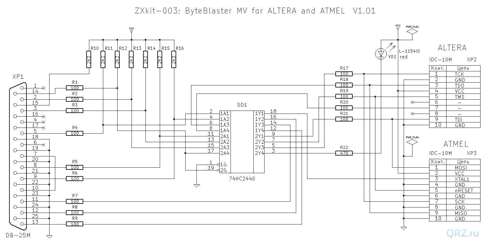 Схема программатора сделана на основе ALTERA ByteBlaster MV (http://www.altera.ru/cgi-bin/go?35)
