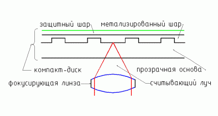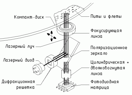 При подаче напряжения питания полупроводниковый лазерный диод генерирует когерентный (разность фаз волн постоянна во времени) луч, который с помощью дифракционной решетки разделяется на основной луч и два дополнительных. Пройдя через элементы оптической системы и фокусирующую линзу, эти лучи попадают на компакт-диск (рис. 1.2).