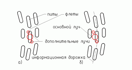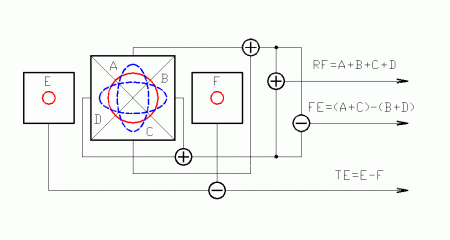 Если луч сфокусирован точно на поверхности компакт-диска, отраженный луч на фотодатчиках имеет форму круга, если перед или за поверхностью - форму эллипса. Сигналы с фотодатчиков предварительно усиливаются, и по разности сигналов (A+C) и (B+D) определяется ошибка фокусировки FE (Focus Error). При точной фокусировке сигнал FE равен нулю. Два боковых луча попадают на датчики E и F. Они используются для отслеживания прохождения основного луча по считываемой дорожке (треку) (рис. 1.4).