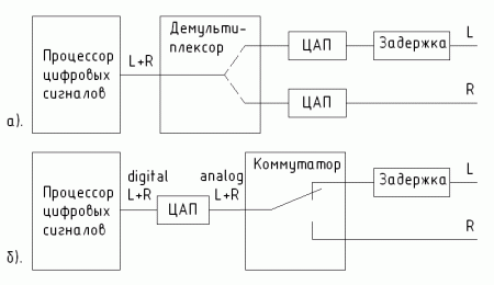 В дорогих моделях используется вариант, показанный на рис. 1.5,а. Мультиплексированный цифровой сигнал поступает на демультиплексор, который по тактирующим импульсам разделяет его на 2 цифровых потока соответственно для левого и правого каналов. Для каждого канала используется свой ЦАП. В другом варианте (рис. 1.5,б) применяется один ЦАП, аналоговый сигнал с которого разделяется коммутатором на два канала. В обоих случаях линия задержки используется для выравнивания по времени данных правого и левого каналов. Аудиосигналы с выхода ЦАП усиливаются и поступают на выходные фильтры. Фильтры обрезают высокочастотные составляющие (>20 кГц), шумы квантования и сглаживают ступеньку. В аудиосхемах используются транзисторные ключи, которые управляются сигналом MUTE и закорачивают выходной сигнал на корпус. Если диск считывается нормально, то в режимах "Воспроизведение" или "Перемотка по треку" процессор отключает блокировку звука. Во всех остальных режимах функция MUTE активизирована. От качества фильтра напрямую зависит качество аудиосигнала. В дорогих моделях используют фильтры более высоких порядков. 1.4 Функционирование проигрывателя в различных режимах1.4.1 Загрузка дискаПри включении проигрывателя в сеть вырабатывается сигнал сброса Reset, который обнуляет регистры процессора. Процессор проверяет положение каретки, лазерной головки (при необходимости позиционирует в начальное положение) и наличие компакт-диска. В некоторых моделях при наличии диска проигрыватель переходит в режим воспроизведения. При нажатии клавиши "Open/Close" процессор подает сигнал на двигатель каретки, каретка выезжает. При полном выезде каретки срабатывает концевик "Конечное положение каретки", и процессор останавливает двигатель. В некоторых моделях проигрывателей применяются электрические схемы без концевиков, которые по силе тока, потребляемого двигателем, определяют начальное и конечное положения каретки. Диск устанавливается в каретку. При повторном нажатии клавиши "Open/Close" процессор запускает двигатель. Каретка заезжает, пока не сработает концевик "Начальное положение каретки". Диск устанавливается на столик и прижимается к нему. Проигрыватель пытается считать заголовок диска. Информация с диска считывается в направлении от центра. Физически заголовок расположен в начале компакт-диска. В нем записана информация о количестве композиций, общем времени и т.п. Если информация считается удачно, на экране высветятся характеристики диска. В противном случае на дисплее появится сообщение "Error", "No Disc" или "-", а в некоторых моделях режим воспроизведения будет заблокирован. 1.4.2 ВоспроизведениеЛГ начинает считывать диск, ищет начало первого трека и начинает воспроизводить его. Одновременно отображаются номер и время трека на дисплее. 1.4.3 ПаузаПриостанавливается воспроизведение диска. Выходной аудиосигнал блокируется. Лазерная головка остается на одном месте. 1.4.4 Перемотка по трекам "<<", ">>"ЛГ ищет начало нужного трека и начинает его воспроизводить. 1.4.5 Перемотка по треку "<<", ">>"В этом режиме ускоренно проигрывается трек. Процессор вырабатывает сигналы JF (прыжок вперед) и JP (прыжок назад). Катушка трекинга и ЛГ медленно перемещаются вперед (назад). Считывающий луч постоянно перепрыгивает с текущей дорожки на следующую. С помощью детектора подсчитывается колич
