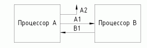 Автор - Ростислав 2 Особенности CD-проигрывателей2.1 Поиск и замена неисправных микросхемНаряду с основными сигналами вырабатывается много вспомогательных. Часто процессоры связаны между собой разными сигналами. Например, процессор А вырабатывает сигнал А1, который поступает к процессору В, а процессор В вырабатывает сигнал В1, который идет к процессору А, и тогда процессор А вырабатывает сигнал А2 (рис. 2.1).