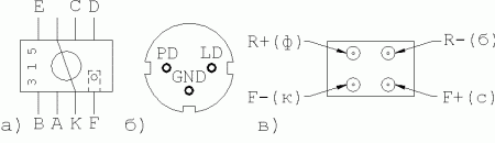 В корпусе головки размещена фотодиодная матрица (FD1-FD6), фотодатчик (UD1), совмещенный в одном корпусе с лазерным диодом (LD1), катушки фокусировки (L1) и трекинга (L2), подстроечный резистор (R1). На рис. 7.1,б показана схема механики головки KSM210B. Она состоит из двигателя диска (Spindle M1), двигателя позиционирования (Slide M2) и концевика "Начальное положение головки" (K1). На рис. 7.2 показаны элементы ЛГ (вид со стороны подключения проводников) и расположение их выводов: а) фотодиодная матрица; б) лазерный диод; в) катушка фокусировки и трекинга (в скобках указаны цвета проводов для головки SF90: фиолетовый, коричневый (синий), серый, белый). Рис. 7.2. Расположение выводов элементов ЛГ KSS210B, SF90