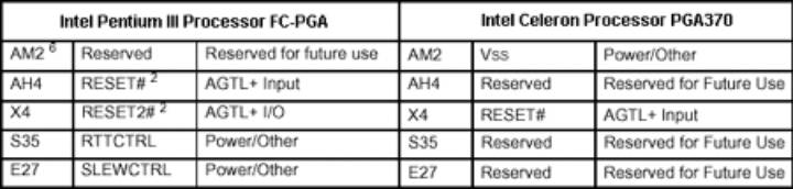 В этом материале детально рассмотрены теоретические различия FC-PGA и PPGA процессорами. Я только суммирую его результаты. В основном PPGA и FC-PGA различаются назначениями нескольких штырьков или контактов. Они представлены в таблице.