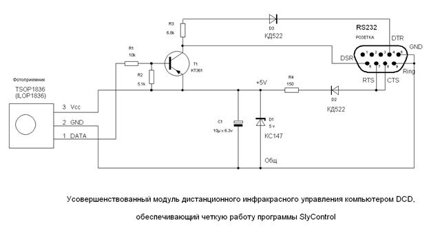Многие желающие воспользоваться программой SlyControl для дистанционного управления компьютером, в частности, при просмотре видео, TV , DVD , SatDVB и др. сталкиваются с очень ненадежной работой программы с самодельными модулями DCD . На самом деле, сама программа работает довольно четко и устойчиво. Причина заключается в том, что в схеме DCD , данной в описании программы SlyControl , как сам фотоприемник, так и COM порт работают в нестандартном режиме. В частности, COM порт требует для четкой работы своих входов двуполярных сигналов обеспечивающих ток порядка 2 мА, выходной ток фотоприемников TSOP 1836 по паспорту не должен превышать 0.5 мА. В приводимых повсеместно схемах DCD это не обеспечивается. Поэтому, в стандартную схему DCD были внесены изменения, заключающиеся в добавлении схемы преобразования логических уровней TTL в двуполярные уровни COM порта. Преобразователь уровней выполнен на p - n - p транзисторе Т1 КТ361 с любой буквой. Номиналы резисторов R1 – R3 подобраны так, чтобы обеспечить на входе DSR COM порта плюс/минус 5 В, что вполне допустимо. Ток по выходу DATA фотоприемника не превышает 0.5 мА. Получаемая фазировка сигнала DSR четко соответствует требованиям программы SlyControl . Схема усовершенствованного модуля DCD приведена на Рис.1 и в файлах DCD . gif или DCD . spl . Рис.1 Эксперименты, проведенные с усовершенствованным модулем DCD и программой SlyControl 2.7.12 показали практически безукоризненную и четкую работу различных стандартных инфракрасных пультов. Если до переделки, работа пульта RC -5 ( Samsung ) была нечеткой, пульт то управлял компьютером, то нет, то после усовершенствования, работа пульта стала очень четкой, а пульт начинал работать правильно практически сразу после загрузки программы. При этом, совершенно неважно, что запускается в первую очередь, то ли, например, ProgDVB или SlyControl . Стоит попросить автора программы SlyControl при усовершенствовании своей программы проследить за тем, чтобы после загрузки программы на выходе DTR COM порта оставался сигнал минус12 В, а на выходе RTS соответственно плюс 12 В.