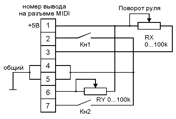 Кнопки для газа и тормоза. Сопротивление переменного резистора от 100 до 220 кОм - обязательно с линейной характеристикой типа "А" У меня стоит 100 кОм. RY - можно тоже использовать для управления газ-тормоз, хотя он нужен в любом случае при калибровке. В "Настройках" в "Панели управления" в "Игровых устройствах" в Windows'е добавить устройство "Джойстик 2 оси и 2 кнопки". Там же можно провести калибровку. В игрушке выбираешь пункт управление джойстиком. В любом случае в каждой игрушке есть калибровка джойстика (в частности в NeedForSpeed 1 она есть). Единственная проблема которая у меня возникла - это когда включаешь управление в игрушке на джойстик - переключение по пунктам тоже осуществляется этим джойстиком, поэтому стоит чуть-чуть повернуть руль от среднего положения и курсор сразу начинает летать по всем пунктам. И вообще при калибровке заметны колебания курсора, которые впрочем во время игры абсолютно ни на что не влияют. Причем я так думаю, что проблема именно в моей звуковой карточке, так как она сама по себе очень сильно шумит (самая дешевая, что поделаешь). Думаю, что при хорошей карточке таких проблем не будет вообще. Купил я наконец-то себе новую звуковую карточку SB Live. Как я и ожидал - все проблемы с дрожанием курсора исчезли. Перестал летать курсор по меню и вообще работает все отлично. Я доволен. Как я говорил руль у меня выпилен из фанеры - я туго обмотал его толстым поролоном и уже поверх черным кожзаменителем. Получилось очень эстетично и просто классно. Вот думаю переделать крепление руля (поставить на подшипники что ли, чтоб не болтался). Купил небольшую аккуратную струбцину, чтобы крепить к столу. Осталось резистор RY закрепить где-нибудь, чтоб не висел на проводах и получится очень даже приличная конструкция. И играть приятно и другим показать не стыдно. Моему сыну уже пять и он гоняет как заправский гонщик. Поставил себе NeedForSpeed III. Все очень здорово! Он сам обнаружил джойстик (т.е. руль) и встал на него. Я не глядя в настройки весь в нетерпении запускаю, ревут двигатели, переключаю тумблер на "газ". "3, 2, 1 GO!" все рванули вперед, а я поехал назад. Нормально. Захожу в настройки - все правильно: "вперед-назад" задано управление самим джойстиком (т.е. резистором RY), а у меня он не используется (но подключен! просто висит на проводах). Ставлю в настройках управление кнопками джойстика. Запускаю, газ на полную, поехали. Начало меня мотать по дороге как новичка-водителя упившегося в "зюзю". Очнь большая чувствительность руля - чуть повернул руль и уже скоблишь стены. Что-то не то. Начал разбираться, вошел в настройки джойстика. Есть там режим "мертвой зоны" центрального положения - уменьшил почти до нуля, стало гораздо лучше. Потом заметил, что у меня руль имеет небольшой люфт (болтается говоря по-русски), затянул потуже. И самое главное поворот руля у меня был градусов 120 (я так поставил ограничители), раньше это не мешало, а теперь пришлось их переставить - угол увеличился почти до 270 градусов. Больше резистор не позволит (хотя больше по-моему и не надо). Машина перестала "рыскать" и больше не мотает со стороны в сторону. Небольшой поворот руля и машина делает плавный поворот по трассе, красиво, аж душа поет. Вот теперь ехать одно удовольствие и я теперь твердо знаю, что рулить курсорными клавишами с клавиатуры - это большое извращение. Единственный недостаток сейча