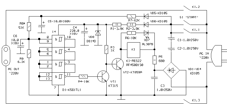 При нажатии кнопки S1 срабатывает K1 и блокируется через свой контакт. При провале напряжения в сети К1 отпускает и вся схема обесточивается. При повышении напряжения в сети положительный потенциал с выхода D1 открывает VT1, при этом VT2 закрывается, К1 отпускает и вся схема обесточивается. Микросхему К561ТЛ1 можно заменить на К561ЛА7, К561ЛЕ5. Последовательное соединение элементов D1 применено для увеличения крутизны вольтамперной характеристики пороговой схемы в случае применения логики вместо триггеров Шмитта. Недостаток схемы - сильный нагрев R1 и R2, поэтому лучше набирать эту цепь из 4-6 резисторов МЛТ-2, либо ставить проволочный резистор на 10 Вт и более. Была попытка собрать схему в корпусе трехштепсельной переноски, удалив две розетки. Схему разместить удалось, но переноска нагревается градусов до 50. В принципе эксплуатировать можно, но вот если кто бросит на нее одежду... То есть, лучше ее монтировать в большом корпусе с вентиляционными отверстиями, либо жестко крепить на стене, причем там, где ее нельзя завесить одеждой. Можно также поставить и силовой трансформатор и вообще отказаться от балластных резисторов и конденсаторов, но тогда схему уже нельзя будет признать простой. Plot - файл PCAD 8.5 схемы + программа печати Plot - в Windows: ac.zip