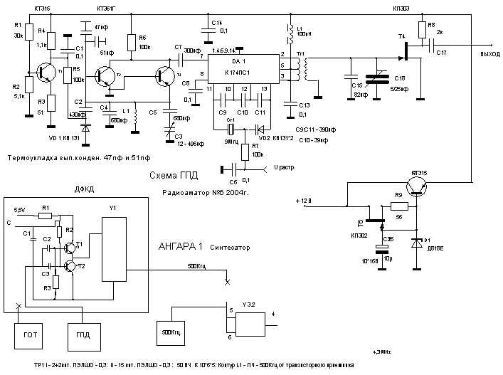 У многих есть радиостанции Ангара 1, но не все могут изготовить контролер который имеется на сайте Краснодарских радиолюбителей. Так и нам пришлось прибегнуть к схеме опубликованной в журнале Радиоаматор № 6 за 2004 г. И спасибо Александру Скидану UR3IGR из г. Краматорск за оказание помощи в настройке. Переделка заключалась в том чтобы найти схему ГПД с высокими характеристиками стабильности частоты, так как даже в UW3DI при частоте 5 – 5.5 Мгц трудно добиться хорошей стабильности, а тут 12 – 18 Мгц. и чтобы работал синтезатор. Вот такая схема и была опубликована, и мы взяли ее для переделки. В синтезаторе радиостанции Ангара 1 был отключен ГОТ на 10 Мгц а вместо него необходимо включить свой ГПД с перестройкой частоты 10.0 – 10.25 Мгц и на выходе ДФКД получим перекрытие от 12 – 18 Мгц . Дополнительно был изготовлен ОГ на 500 Кгц так как частота стала перестраиваемой необходимо было установить частоту равной 500 Кгц.