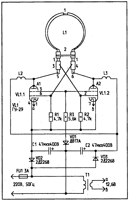 Позднее в [2] был опубликован более мощный вариант прибора на двух ГУ-50. Я советую делать аппарат по схеме [2], так как аппарат по схеме [1] немного слабоват и требует большего времени прогрева сустава. К тому-же лампы ГУ-50 и панели к ним менее дефицитны, чем для ГУ-29. Схема второго варианта: