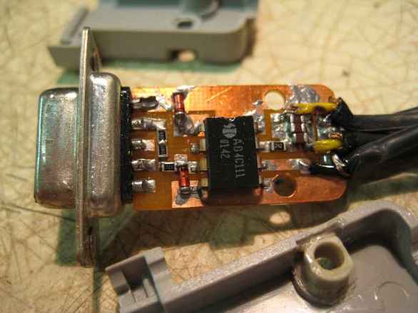 Схема собрана на SMD элементах, чтобы всё упаковать в один разъем DB9 (см. рисунок 2). Элементы взял со старой материнской платы (резисторы и диоды), транзистор T04 (аналог SMD КТ315). Печатную плату разработал в программе Sprint-Layout 6.0. Перед сборкой подравнял края напильником под размер разъема DB9 (17х15мм). Макет печатной платы прилагаю. В итоге получил компактный интерфейс, представленный на рисунке 3.