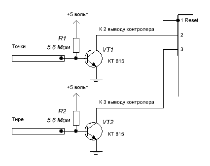 Работает схема следующим образом. После подачи питания, контроллер постоянно опрашивает со скоростью 500 000 раз в секунду все контакты по очереди. Кроме клавиши «Reset», естественно. При замыкании ключа на точки или тире он начинает выдавать соответствующие пачки импульсов. Начальная скорость передачи знаков, при загрузки контроллера составляет около 30 знаков минуту. Регулировка скорости передачи осуществляется клавишами S3-S4. Для этого надо нажать и удерживать соответствующую клавишу. Скорость начнет плавно регулироваться. Диапазон настройки скорости составляет от 30 до 240 знаков в минуту. На практике скорость регулируется до бесконечности. Например, на минимальной скорости, длина точки составляет 13 секунд. На максимальной, скорость передачи составляет 900 точек в секунду. Понятно, что это и не нужно, но на максимальном режиме данный ключ можно использовать в качестве генератора 1 кгц. Для удобства оператора, клавишей S5 включается автоматическая передача CQ. Вид текста: «CQ CQ CQ DE», далее оператор подставляет свой позывной. Для того, что б сохранить текущую скорость в энергонезависимую память, нужно нажать клавишу S6. Для того, что б извлечь, например, при новом включении контроллера, кнопку «Read» Данная схема работает на частоте 4 Мгц. От внутреннего генератора. В качестве контроля применяется Бипер уже с готовой заданной частотой. Транзистор КТ 815 с любой буквой. Следует учесть если будет применятся реле, то в включить защитный диод на обмотку реле. Питание 5 вольт, желательно через микросхему серией 7805. Для себя я сделал сенсорный телеграфный манипулятор. Рис 2.