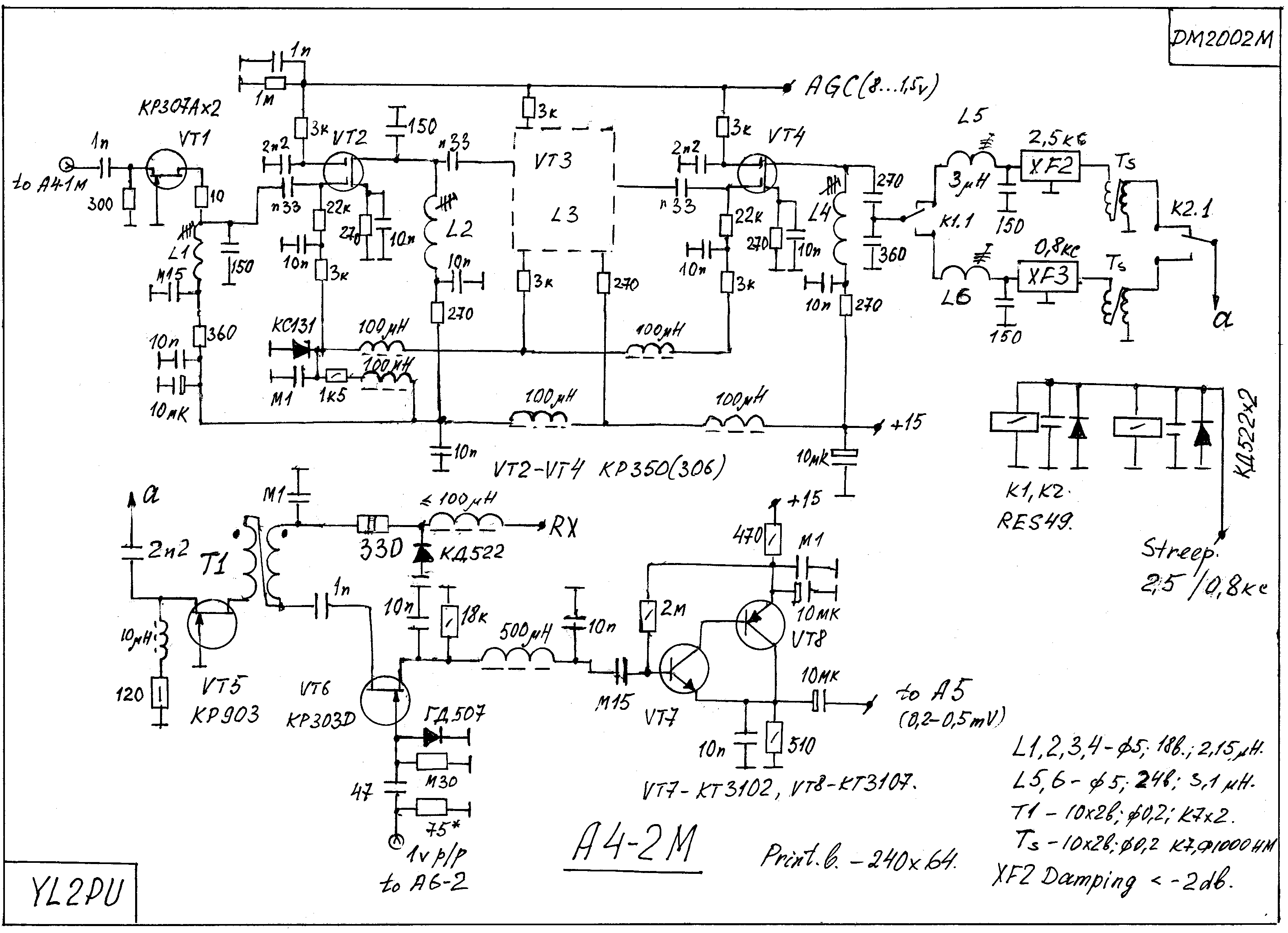 Плата А4-2М – основная ПЧ с дополнительной селекцией на XF2, XF3. От "старой" А4-2 - отличается тем, что сокращено кол – во элементов и упрощена коммутация. Фильтры XF1 и XF 2 одинаковы, имеют полосу пропускания 2.5 Kc и затухание в полосе, при согласовании по схеме А4-2М, менее 2 db. На конкретном экземпляре было – 1,58 db. Фильтры выполнены по описанию, смотри в журнале Радио на DM2002 / YL2PU .