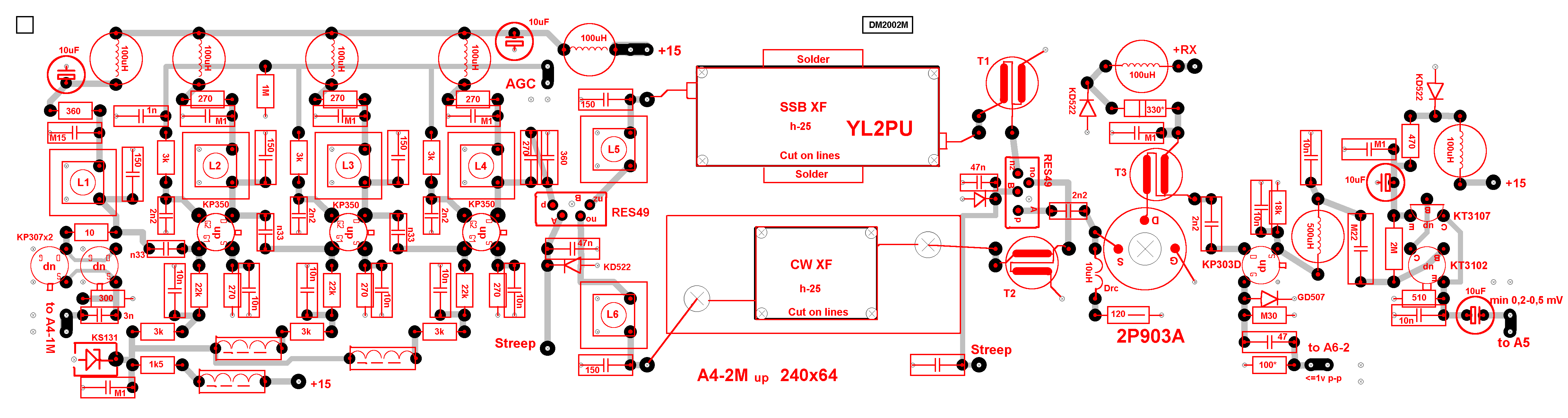 Платы А1, А3 – ФНЧ, ДПФ – без изменений. Плата А2( New ) – РА на 2P901Ax2 (~40 w) – раслоложена на задней стенке, рядом с А1. Все данные на нее на сайтах СКР и QRZ. Платы А5 (УНЧ, АРУ), А6-1, А6-2 (Формирователи SSB / CW) – можете применить по описанию на DM2002, или фантазировать сами, соблюдая указанные уровни. Главное – входные полосовики А3, ДПФ - делайте по Рэду и не упрощайте , ДИНАМИКА и прочее.
