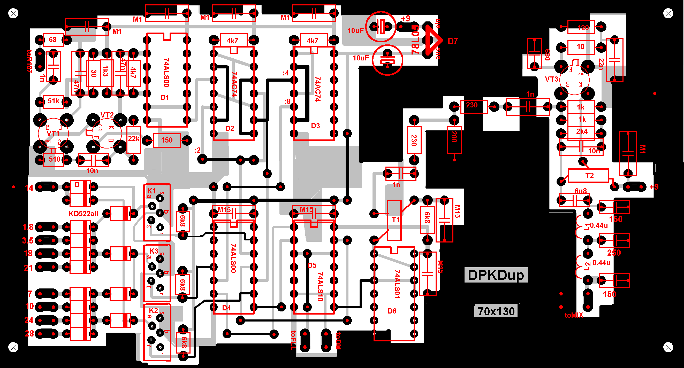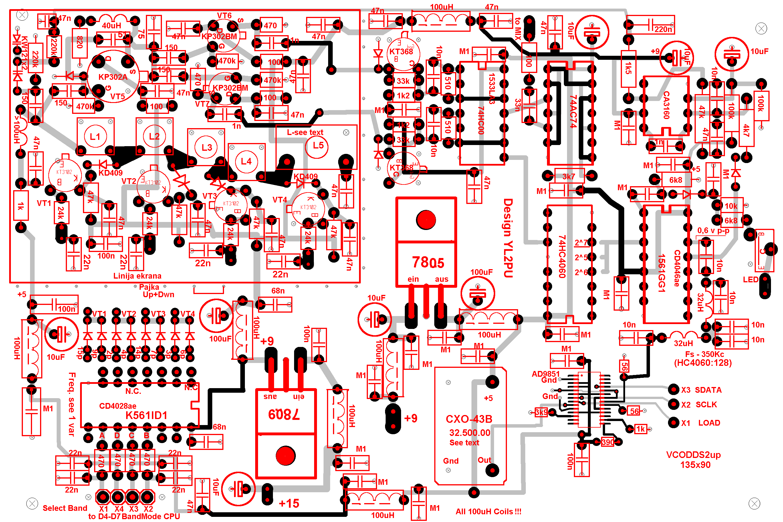 Печатки выполнены в формате LAY, рисунки расположения деталей на платах в цвете, в PCX. Фольга сверху сохранена, платы после настройки закрыть экранами, коробки из дюраля, или из стекло-гетинакса.(Можно из луженой жести - J )