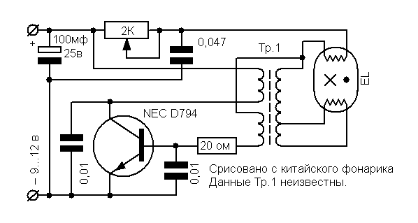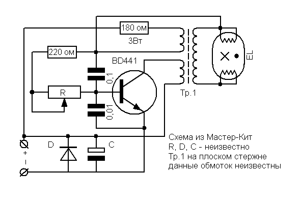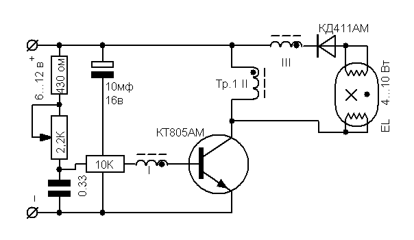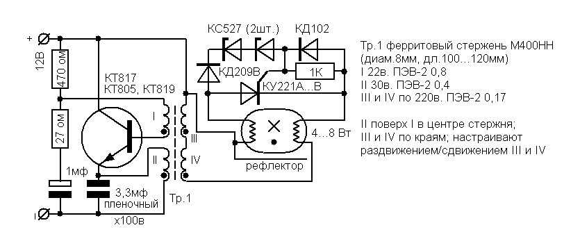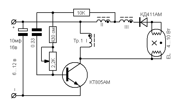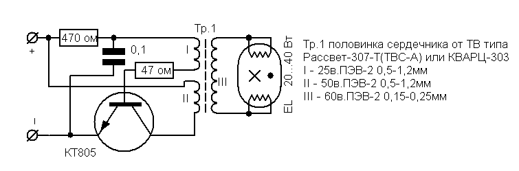 Схема 1. Здесь интересное решение подогрева спиралей лампы.
