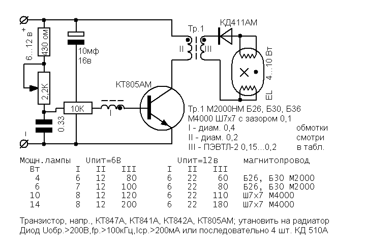 Схема 11. Генератор по этой схеме собирал - работает. Интерес представляет подогрев спиралей лампы. Желающие повторить эту схему используйте другой магнитопровод, например, Ш-образный. Я использовал ферритовый стержень. О результатах работы прошу сообщить на
