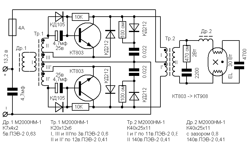 Схема 10. Не смотря на внешнюю сложность от предыдущих схем отличается большим КПД. Обратите внимание на намоточные данные Др.1 и Тр.1.