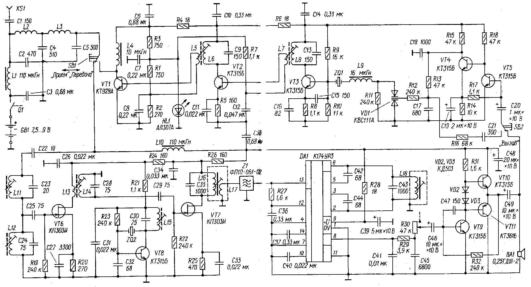сопротивление передатчика - 50 Ом. Чувствительность приемника при отношении сигнал/шум 12 дБ - не хуже 1 мкВ, селективность по соседнему и побочным каналам приема - не хуже 40 дБ- Диапазон воспроизводимых частот по уровню -3 дБ - 300...3000 Гц. Выходная мощность при указанных выше значениях напряжения питания соответственно 60, 100 и 150 мВт, потребляемый ток - 12, 14 и 16 мА. Пределы регулирования громкости - не менее 30 дБ. Допустимое значение входного сигнала - от 0,3 мкВ до 100 мВ. Габариты радиостанции (без антенны) - 170х66х32 мм, масса - около 350 г. Принципиальная схема радиостанция изображена на рис. 1. Передатчик состоит из микрофонного усилителя, частотного модулятора, задающего генератора и усилителя мощности. Микрофонный усилитель собран на транзисторах VT4 и VT5. Микрофоном служит динамическая головка ВА1, Громкие звуковые сигналы симметрично ограничиваются в коллекторной цепи транзистора VT4. Гармоники, возникающие при ограничении, ослабляются фильтром нижних частот (ФНЧ) C17R13C18. Для тонального вызова кнопкой SB2 замыкают цепь положительной обратной связи R16C21, превращающей усилитель в генератор сигнала частотой примерно 1,5 кГц. Частотный модулятор содержит варикап VD1 и дроссель L9, образующие контур, настроенный примерно на частоту 9867 кГц и включенный, последовательно с кварцевым резонатором TQ 1, При модуляции изменяется реактивное сопротивление цепи, и, следовательно, частота колебаний. Задающий генератор выполнен на транзисторе VT3 по схеме емкостной трехточки. Кварцевый резонатор ZQ1 с частотой 29600 кГц по третьей гармонике возбуждается на основной частоте 9867 кГц. Третья гармоника выделяется контуром LBC13 в коллекторной цепи транзистора VT3. Рис.1 На транзисторе VT2 выполнен предварительный усилитель, на VT1 - оконечный усилитель мощности. Межкаскадния связь - трансформаторная, с помощью катушек связи 1-5 и L7. Контур L6C9 также настроен на частоту 29600 кГц. Напряжение смещения тразисторов VT1, VT2 стабилизировано включенным в прямом направлении светодиодом HL1, одновременно индицирующим режим передачи. На цыходе передатчика включен двойной П-контур низкой добротности L2C2C4L3C5, хорошо подавляющий гармоники. Переключатель SB1 ("Прием"-"Передача") коммутирует одновременно сигнал РЧ и напряжение питания, что позволило обойтись одной группой контактов. Для отделения постоянной составляющей тока питания служат дроссели LI, L4, L10 и конденсатор С1, Приемник радиостанции - супергетеродин с одним преобразованием частоты и ПЧ, равной 465 кГц. Для подавления зеркального катала приема ярн столь низкой ПЧ применены контуры РЧ повышенной добротности. Сигнал с антенного П-контура через переключатель SB1 подается на контуры преселектора L1IC23, L12C24 и далее на усилитель РЧ, выполненный на полевом транзисторе VT6. Его стабильная работа обеспечивается малым числом витков катушки связи L13, что, кстати, благоприятно сказывается и на добротности контура смесителя U4C28. Гетеродин [VT8) работает на частоте третьей гармоники кварцевого резонатора Z02 - 29135 кГц. Сигнал гетеродина поступает на смеситель благодаря индуктивной связи катушек гетеродина L15 н усилителя РЧ L14. Смеситель приемника также собран на полевом транзисторе (VT7). Осноную селективность па соседнему каналу обеспечивает пьезокерамический фильтр Z1. Контур L16C35 повышает селективность на частотах, лежащих за пределами его полосы пропускани