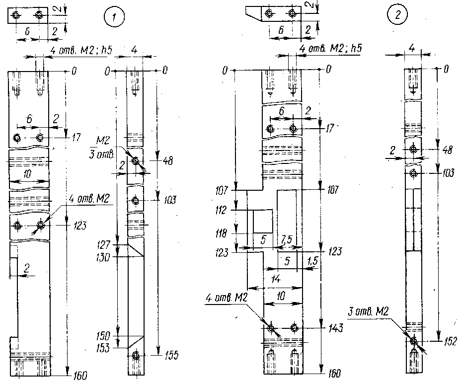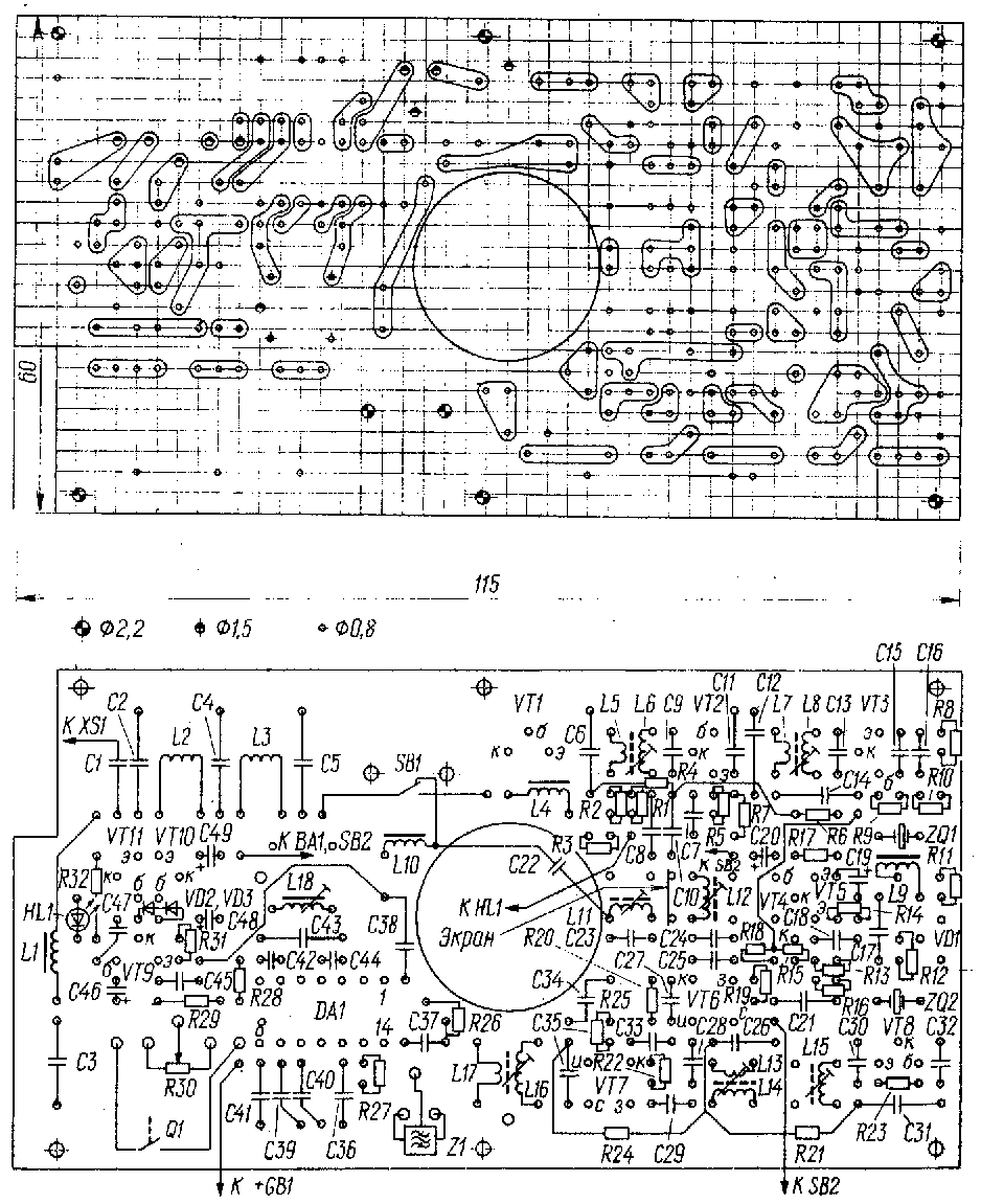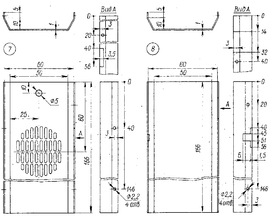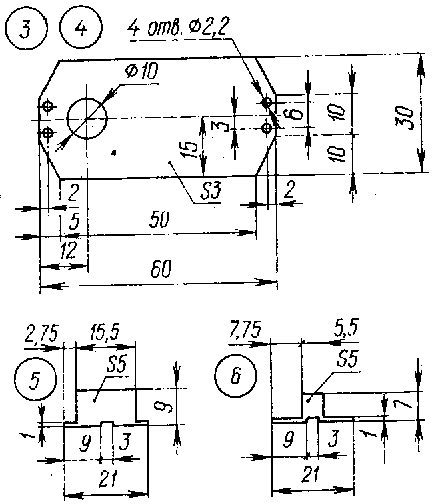 В радиостанции применены постоянные резисторы МЛТ-0,125, переменный резистор с выключателем СПЗ-Зб, конденсаторы КТ-1 (Cl, C22), К10-в (С2, С4, С5, С23 - С25. С28 - СЗО, С32, С35, С42 - С44, С47), KM (C3, Сб - С18, С21, С26, С27, С31, СЗЗ, С34, С36 - С38, С40, С41. С45) и К50-6 (остальные). В качестве С17, С18, С21, С27, С31, СЗЗ, С34, СЗб, С37, С40. С41, С45 возможно применение конденсаторов КЛС, КЛГ, В задающем генераторе и контурах передатчика желательно использовать конденсаторы групп (по ТКЕ) М75 (С9, CI3, С15) и М47 (С16). Основа кнопочных переключателей SB1, SB2 - микропереключатели МП11 (возможна замена на МПЗ-1, МП9, МП10 и т. п.).- Катушки L2 и L3 - бескаркасные (внутрений диаметр - 5,5 мм), намотаны виток к витку и содержат по 8 витков провода ПЭЛ 0,8. Большинство остальных катушек намотаны на унифицированных полистироловых каркасах диаметром 5,5 мм с подстроечникамн (М4х6) от броневых магнитопроводов СБ-12в из карбонильного железа. Контурные катушки L6, L8 (по 5,75 витка) и L12, L14, L15 (по 7,75 витка) намотаны виток к витку проводом ПЭЛ 0,44, a L5. L7 и L13 (по 1,75 витка) - ПЭЛШО 0,25 поверх соответствующих контурных катушек. Катушка L11 содержит 20 витков провода ПЭЛ 0,25. Катушки фильтров ПЧ L16 - L18 намотаны на унифицированных трехсекционных каркасах, помещенных в броневые магнитопроводы из ферритовых (600НН) чашек внешним диаметром 8,6 мм с подстроечниками СС2,8х12 из феррита той же марки, и снабжены экранами (использована арматура от фильтров ПЧ транзисторного радиоприемника "Селга"). Обмотки L16 и L18 содержат по 75 витков высокочастотного провода ЛЭ 3х0,07, L17 (намотана поверх L16) - 25 витков ПЭЛШО 0.07. Дроссели L1, L4, L9 и НО - унифицированные Д-0,1. Кварцевый резонатор ZO I - на частоту 9867 кГц (основная гармоника). Z02 - на 29135 кГц (третья гармоника). Все детали радиостанции, кроме гнезда антенны (любое малогабаритное, желательно коаксиальное, например от разъемного соединителя СР-50) и батареи питания, монтируют на печатной плате (см. рис. 2) из одностороннего фольгиоанного стеклотекстолита толщиной 1,5 мм. При изготовлении платы следует учесть, что замкнутые линии на рисунке символизируют не только контуры печатных проводников, но и удаляемые узкие участки фольги. Иными словами, все печатные проводники на готовой плате должны быть со всех сторон окружены фольгой общего провода (между близко расположенными проводниками разделительные дорожки общего провода допускается не проводить). Все постоянные резисторы и дроссели (кроме L1) устанавливают перпендикулярно плате, переменный резистор R30 и светодиод HL1 закрепляют-на ней пайкой выводов к соответствующим печатным проводникам, микропереключатели SB1 и SB2 (их устанавливают один на другой) - с помощью двух винтов М2х20 и гаек. Основа корпуса трансивера - боковины 1 и 2 (см. рис. 3), изготовленные из листовою дюралюминия толщиной 4 мм. К ним привинчивают печатную плату, а также верхнюю (3) и нижнюю (4) стенки (см. рис. 4; нижняя стенка отличается от верхней отсутствием отверстия диаметром 10 мм). Перед установкой платы в прямоугольные отверста правой боковины вставляют кнопки 5 переключателя "Прием" "Передача" и 6 выключателя "Вызов". В оставшемся пространстве у нижней стенки размещают кассету с элементами батареи питания (см. рис. 5). Динамическую головку вставляют магнитной системой в отверстие в печатной плате со стороны печатных проводников. Между диффузороержателем и платой помещают поролоновую прокладку в виде кольца внешним диаметром 5