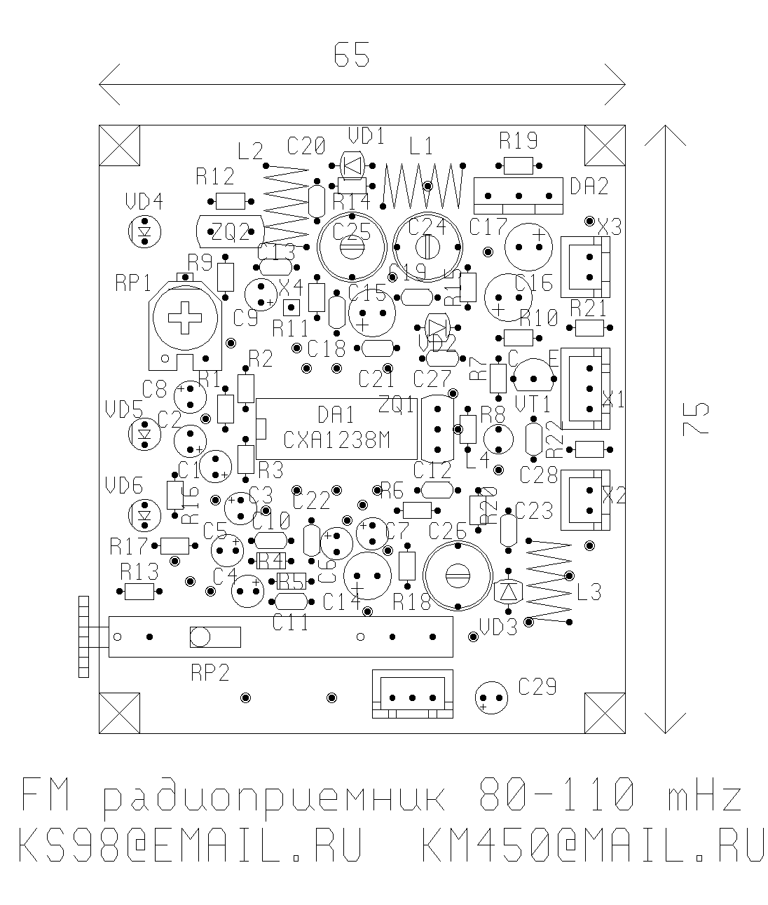 УНЧ собран на микросхемах DA1 - КА2250 и DA2 - ВА5406. Первая представляет собой электронный регулятор громкости, вторая - стереофонический УНЧ с малым напряжением питания и выходной мощностью до 5 ватт в канале при нагрузке до 3 ом и малыми искажениями - 0.3% при выходной мощности 0.5 вт. СтереоприемникРис.1 - схема приемника (Щелкните мышью для увеличения изображения) Высокочастотный сигнал радиостанций, принимаемый антенной, подключенной к разъему Х2, поступает на колебательный контур L3C26VD3C23 и далее через УВЧ на транзисторе VT1 КТ368Б на вход УВЧ микросхемы (вывод 18). Усиленный сигнал выделяется на нагрузке УВЧ, перестраиваемом контуре L1C24VD2C19 и попадает на смеситель микросхемы. На смеситель также подается сигнал гетеродина, частота которого определяется контуром L2C25VD1C20. Настройка этого контура всегда больше частоты входного сигнала на 10.7 МГц. Перестройка по диапазону осуществляется за счет изменения напряжения на варикапах VD1, VD2 и VD3 переменным резистром RP2 "TUNING". С вывода 10 на вывод 24 микросхемы через фильтр R11R12C13 подается напряжение автоподстройки частоты, порог срабатывания которой можно регулировать изменением емкости С3. С выхода смесителя (вывод 16) через полосовой фильтр ZQ1 сигнал промежуточной частоты подается на встроенный усилитель-ограничитель и демодулируется фазовым детектором микросхемы. Комплексный стереосигнал декодируется встроенным стереодекодером и на выходах 5 и 6 микросхемы DA1 уже имеем полный низкочастотный стереосигнал. Уровень сигнала на выходе микросхемы порядка 100 мВ, что достаточно практически для любого УНЧ. Питание микросхемы осуществляется стабилизированным +5V напряжением от стабилизатора DA2 на микросхеме 7805. Можно было применнить и 78L05 (как транзистор), но я использовал для надежности первую т.к. от нее еще питаются светодиоды индикации. При монтаже я ее утопил, а крепежное отверстие спилил. Детали тюнера подобраны самые миниатюрные. Это позволило получить малые размеры - 65*75*15 мм и минимальные наводки на приемник, что положительно для его стабильной работы. Резисторы импортные размером в половину наших МЛТ-0,12. Можно применить их в вертикальном положении. Пьезофильтры ZQ1, ZQ2 и ZQ3 - SFE-10.7 (я использовал от какого-то дохлого китайского приемника). Варикапы типа КВ109В, но можно использовать любые подходящие по параметрам. Я использовал импортные ВВ639. Катушки L1, L2, L3 не имеют каркаса, намотаны проводом ПЭЛ-0.5 на оправке диаметром 3 мм (я использовал стержень от шариковой ручки) и содержат соответственно 7, 6, 3+3 витков. После намотки катушки следует слегка растянуть. Для настройки по диапазону использован многооборотный резистор СП3-36. Можно использовать и любой другой, подключив к разъему Х5 (на схеме не указан, см. рисунок платы). Подстроечные конденсаторы имеют номинал примерно 5-15 пф. Дроссель L4 имеет номинал 50-100мкГн, любой малогабаритный. Рис.2 - расположение элементов на плате (Щелкните мышью для увеличения изображения) Рис.3 - рисунок печатной платы со стороны деталей (Щелкните мышью для увеличения изображения) Рис.4 - рисунок печатной платы с обратной стороны (Щелкните мышью для увеличения изображения) Настройка.Перед включением необходимо тщательно проверить монтаж, особенно на наличие "соплей" между дорожками. Уверяю это избавит от многих непонятных неприятностей. Не поленитесь! Подключите к выходу стереоприемн