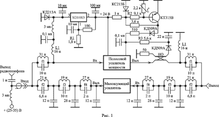 Описан удлинитель для радиотелефона типа "Харвест", устанавливаемый на мачте антенны в непосредственной близости от антенны и позволяющий в 5-10 раз увеличить дальность действия радиотелефона. Технические характеристики удлинителя: выходная мощность усилителя передатчика 30 Вт при изменении входной мощности в пределах 0,2 - 5 Вт; коэффициент шума усилителя приемника 2 дБ; напряжение питания 25-35 В; удлинитель сохраняет работоспособность при внезапном длительном отключении и коротком замыкании нагрузки, имеет термозащиту. Имеющиеся в продаже удлинители радиотелефонов (УР) типа "Харвест" имеют следующие недостатки. Транзисторы усилителя мощности не имеют начального смещения, что приводит к недоиспользованию транзисторов по мощности. Изменение длины кабеля снижения, из-за потерь в кабеле, приводит к изменению напряжения питания и снижению выходной мощности. Отсутствие защиты от короткого замыкания и холостого хода нагрузки, термозащиты снижает надежность УР. Рис.1. Щелкните мышью для увеличения На рис. 1 приведена принципиальная схема УР, содержащая полосовой усилитель мощности (ПУМ); малошумящий усилитель (МУ); стабилизатор напряжения; фильтры нижних (ФНЧ) и верхних (ФВЧ) частот; схему защиты от рассогласования по выходу; термозащиту. УР излучает сигналы в полосе частот 393-403 МГц и одновременно принимает сигналы в полосе 263-273 МГц. ФВЧ стоящие в канале передачи состоят из контура, настроенного на частоту =270 МГц, и индуктивности , имеют частоту среза 380 МГц и служат для исключения потерь принимаемого сигнала. ФНЧ стоящие в канале приема состоят из контуров, настроенных на частоты = 400 МГц, = 350 МГц, =680 МГц, и конденсаторов 12 пФ и 28 пФ, имеют частоту среза 280 МГц, затухание на частоте 400 МГц равное 65-70 дБ и служат для исключения возможности попадания сигнала передатчика на транзистор МУ. Стабилизатор напряжения на микросхеме SD1083 имеет выходное напряжение 24 В, которое устанавливается с помощью подбора резистора , и позволяет устранить влияние длины кабеля снижения на величину напряжения питания УР. Экспериментальные исследования различных видов высокочастотных кабелей позволили установить, что при длине кабеля до 50 метров и токе потребления УР равном 3 А потери напряжения питания в кабеле составляю величину 5- 7 В. Это следует учитывать при выборе напряжения источника питания УР. Направленный ответвитель (НО) отраженной волны и последовательно включенный детектор на диоде КД509А служат для определения уровня рассогласования нагрузки с выходным сопротивлением ПУМ. При превышении этим уровнем определенного значения сигнал управления с детектора на диоде КД509А, подаваемый на вход сигнала управления ПУМ (см. рис. 2), будет приводить к уменьшению напряжения базового смещения транзисторов ПУМ и уменьшению напряжения питания входного каскада. Поэтому, начиная с некоторого значения коэффициента стоячей волны по напряжению (КСВН) со стороны нагрузки, мощность сигнала на выходе ПУМ будет падать пропорционально росту КСВН нагрузки. Порог срабатывания схемы защиты от рассогласования ПУМ по выходу устанавливается выбором резистора . НО выполнен из двух проводов марки МГТФ 1х0,35 длиной 20 мм, намотанных вплотную друг к другу на цилиндрический изолятор диаметром 5 мм, который помещается затем в заземленный металлический цилиндрический экран. В ра