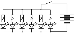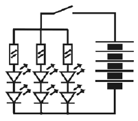 Рис. 1. Последовательное соединение светодиодов Выключатель - любой малогабаритный. Отражатель в этой оптической системе не нужен, какие-либо фокусирующие элементы - тоже. Наоборот, диаграмма излучения этих светодиодов настолько узкая, что на плате их оказалось необходимо распаивать и разгибать немного "веером" - иначе пятно света на дороге получается очень яркое, но узкое. Внешнее стекло с оптической точки зрения излишне, но для защиты от грязи, дождя и механических повреждений я решил его все-таки установить. Но если нет возможности обработать "настоящее" стекло - тогда лучше не ставить вообще никакого: на оргстекле будут очень большие потери.
