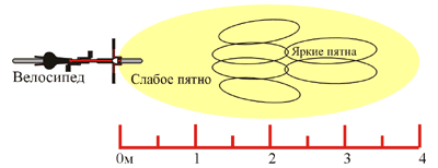 Рис. 2. Световое пятно на дороге - схематически Фотографии велофары(здесь на странице - превьюшки, кому надо посмотреть крупно - открывайте оригиналы. 640х480, около 16К)