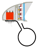 Рис 5. Фара в разрезе. Для фиксациии стекла и печатной платы на верхнюю и нижнюю половинки корпуса по месту приклеиваются брусочки (примерно 2х2х20мм). Между ними образуются пазы, надежно удерживающие плату и стекло. Этот рисунок - тоже миниатюра, его можно посмотреть крупно.
