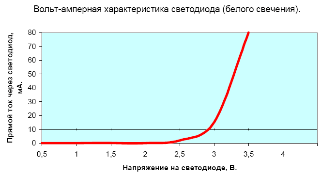 Как известно, светодиод имеет нелинейную вольтамперную характеристику с характерной "пяткой" на начальном участке.