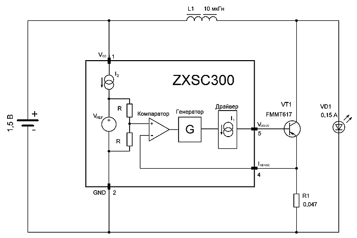 Рассмотрим принцип работы ZXSC300. На рисунке Рис.2 показана одна из типовых схем питания белого светодиода импульсным током с помощью ZXSC300. Импульсный режим питания светодиода позволяет максимально эффективно использовать энергию, имеющуюся в батарейке или аккумуляторе.