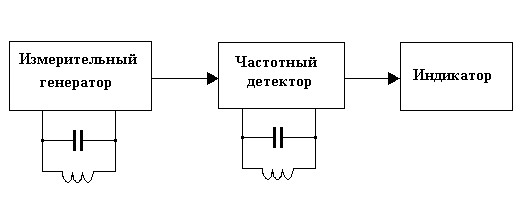 Колебательный контур частотного детектора имеет резонансную частоту, близкую к частоте поискового генератора. Изменение частоты генератора приводит к изменению амплитуды сигнала на контуре, что фиксируется помощью индикатора, например стрелочного прибора. Такие приборы не нашли широкого применения. Их недостатки - необходимость обеспечения стабильной амплитуды сигнала на выходе генератора, а также необходимость подстройки резонансной частоты контура из-за влияния дестабилизирующих факторов как на контур поискового генератора, так и на контур частотного детектора.