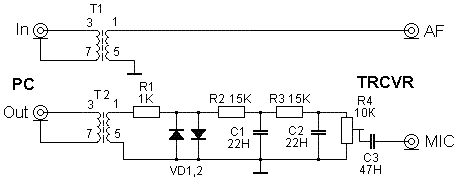 При работе в цифровых видах связи, желательно гальванически "развязать" компьютер и трансивер. В статье UA1ZH было упомянуто, что в качестве трансформаторов, можно использовать обмотки реле. Перебрав несколько типов, остановился на РПС34Б. Сопротивление обмоток - 980 Ом. Для более качественного сигнала, применен простейший пассивный фильтр, с частотой среза около 3-х кГц и диодный ограничитель на диодах. Схема показана на Рис 1.