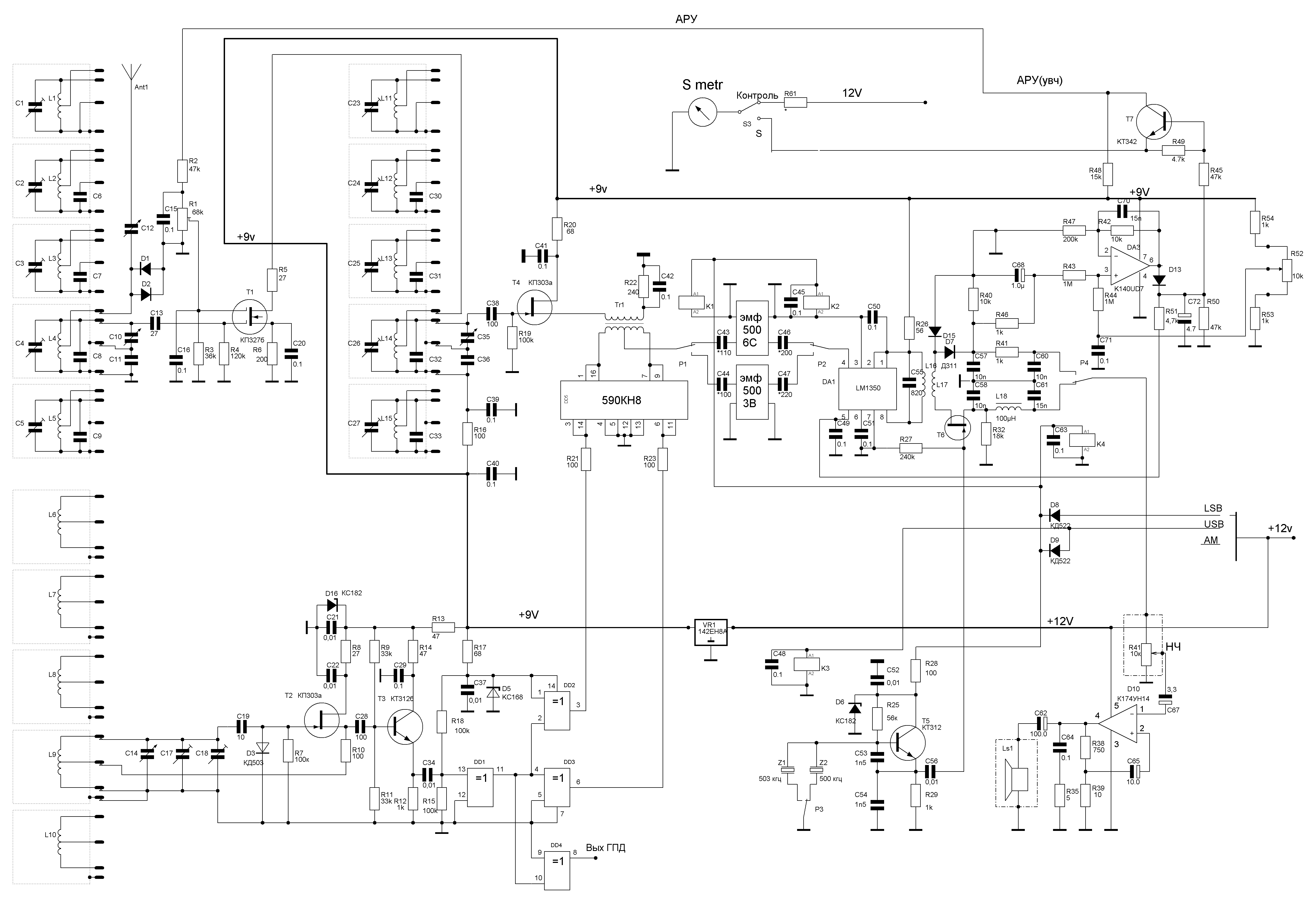 Входная цепь приемника состоит из конденсатора связи с антенной и входного контура. Конденсатор связи используется для подстройки входа приемника при использовании различных антенн. Переключение диапазонов производится при помощи переключателя поддиапазонов, выполненного в виде вращающегося барабана. Усилитель напряжения высокой частоты собран на полевом транзисторе