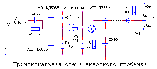 Питание +5v на все микросхемы подводится к выводу с максимальным номером. С общим проводом соединяется вывод с вдвое меньшим номером. Между цепями питания необходимо включить 2...3 блокировочных конденсатора 0,01...0,1Мк. Светодиод HL1 используется в качестве стабилитрона с напряжением стабилизации около 1,5v. Это напряжение обеспечивает надежное запирание ключевых транзисторов. Цепь C4, R1 необходима для сброса при включении сети. Первоначально для DD5, DD6 использовалась 531 серия ТТЛШ микросхем. Это обеспечивало верхнюю границу измеряемых частот до 70мгц. В дальнейшем появилась КМОП серия 1554, которая позволила поднять ее до 100мгц. Следует только иметь в виду, что входы КМОП микросхем нельзя оставлять не подключенными. Поэтому выводы 12, 13 DD5 и 1, 4, 10, 13 DD6 нужно подключить к +5v. Приведенная ниже схема входного формирователя рассчитана на работу именно с КМОП триггером Шмитта ( DD5). В настоящее время не составляет труда приобрести микроконтроллер с встроенной памятью программ 87C51 или AT89C51. В этом случае схема существенно упрощается, в нее нужно внести следующие изменения: DD5.4 исключается, вывод 11 DD3 подключается к +5v. Между Р0.0 - Р0.7 и +5v желательно включить подтягивающие резисторы 10к, хотя, как показала практика, прибор нормально работает и без них. DD2, DD4 исключаются, DD3 тоже можно исключить, если нагрузочная способность порта достаточна для управления ключами индикатора (вакуумный индикатор). Вывод 31 DD1 отключается от "земли" и подключается к +5v. Программа для работы с внешним и внутренним ПЗУ имеет некоторые отличия. Линии dF и F (выводы 12 и 13 DD1) подсоединяются к двум кнопкам на замыкание без фиксации, установленным на лицевой панели. Вторые контакты этих кнопок подсоединяются к общему проводу. При кратковременном нажатии на кнопку dF частотомер переходит в режим измерения нестабильности частоты. При этом на индикатор выводится разность между текущим значением частоты и тем, которое было в момент перехода в этот режим. В старшем разряде индицируется знак отклонения частоты, поэтому диапазон измерения отклонения равен 10 Мгц. При нажатии на кнопку F прибор возвращается в режим измерения частоты. Этот режим устанавливается и при включении питания. Линия 1/10 (вывод 14 DD1) подсоединяется к свободному контакту входного разъема. Она предназначена для удобства работы при использовании внешнего СВЧ делителя на 10. На ответной части разъема распаивается перемычка между этим контактом и контактом, соединенным с общим проводом. Таким образом, при подключении внешнего делителя на 10, расширяющего диапазон измеряемых частот, эта линия соединяется с общим проводом. При этом соответствующим образом изменяется расположение десятичных точек на индикаторе. При работе без СВЧ делителя, т.е. при измерении частот до 100 Мгц, этот контакт должен оставаться свободным. С внешним СВЧ делителем цена младшего разряда - 10 Герц, а верхнее значение измеряемой частоты определяется быстродействием делителя, но не может превышать 1000 Мгц. Схема делителя, показанная на рисунке, имеет диапазон рабочих частот 30...400 Мгц. |