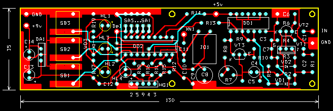 В первом варианте программы SA1 ... SA4 служат для выбора одного из 15 заранее запрограммированных значений ПЧ. Соответствующий номер ПЧ набирается в коде 1-2-4-8. Если переключатели SA1 ... SA4 разомкнуты, ПЧ = 0 (режим частотомера). Во втором варианте количество ПЧ равно 7, т.к. SA4 используется для выбора номера делителя. Выводы SA5, а во втором варианте и SA4 подсоединены к свободным контактам разъема, в который включается СВЧ делитель. На ответной части разъема между этими контактами и общим проводом могут быть установлены перемычки. Таким образом автоматически определяется подключение делителя и его номер. При необходимости на плату можно установить DIP переключатели для выбора ПЧ и делителя. Транзистор VT1 - полевой с изолированным затвором, каналом n-типа и напряжением затвор-исток 0...2в при токе стока 5ма - КП305А,Б,В; КП313А,Б; VT2, VT3 - КТ316, КТ368 и др. с граничной частотой не менее 600МГц. DD1 - 74AC14 можно заменить на КР1554ТЛ2 или КР1554ТЛ3. В последнем случае потребуется подкорректировать рисунок печатной платы. Неиспользуемые входы всех элементов DD1 следует подключить к +5в. Применение ТТЛ аналогов в данной схеме нежелательно, т.к. это резко снижает верхнюю границу рабочих частот (до 10 ... 15МГц). Светодиоды HL1...HL4 красного цвета свечения. |