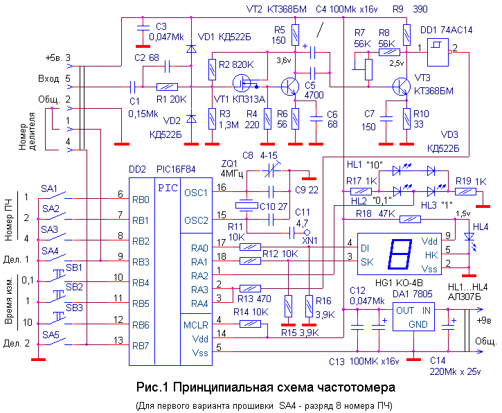 Разработано два варианта программы PIC контроллера для этого частотомера. Первый вариант позволяет использовать для измерения частот выше 40МГц один внешний СВЧ делитель с любыи коэффициентом деления в диапазоне 2...255. Второй вариант допускает использование трех внешних делителей с различными коэффициентами деления, а диапазон допустимых значений Кд расширен до 256. Номер подключенного в данный момент делителя определяется автоматически. Схему СВЧ делителя на 10 можно взять из другой конструкции автора - Частотомер на однокристальном микроконтроллере. При использовании прибора с первым вариантом программы в качестве цифровой шкалы, в его энергонезависимую память можно записать до 15 промежуточных частот в диапазоне от 0 до 800МГц. Во втором варианте программы количество ПЧ не может превышать 7. Их значения вводятся с точностью до 100Гц и в любой момент могут быть изменены пользователем с помощью 3-х кнопок, расположенных на передней панели прибора. При этом показания индикатора будут определяться формулой: