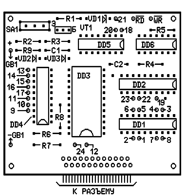 Нумерация разрядов DD1, DD2 и DD4 несколько отличается от стандартной, а контактные площадки для подпайки кабеля расположены непосредственно около соответствующих выводов микросхем. Благодаря этим, вполне допустимым на мой взгляд упрощениям, плата доступна для ручного изготовления. Для обеспечения механической прочности все проводники кабеля перед распайкой пропускаются в отверстия диаметром 1,5 мм, расположенные в нижней части платы. В качестве разъема удобно использовать неисправную микросхему подходящего размера, например 573РФ2/5 в белом керамическом корпусе с позолоченными выводами, удалив из нее кристалл. Кабель подпаивается непосредственно к верхней части выводов таким образом, чтобы он не мешал при установке в панельку. Перед распайкой кабеля следует омметром проверить отсутствие замкнутых между собой выводов микросхемы. Для выводов WR и RD на плате следует установить миниатюрные гнезда. Батарея GB1 составлена из трех аккумуляторов Д 0,06. Последовательно с ней следует включить не показанный на схеме миниатюрный выключатель для исключения разрядки аккумуляторов при длительных перерывах в работе. Регистры К1533ИР22 можно заменить на К1533ИР33, у которых более удобно расположены выводы. Допустима замена К1533АП6 на К1533АП9,АП16; К1533ИД7 - на К1533ИД4 в режиме дешифратора 3*8. При этом потребуется соответственно доработать печатную плату. Все микросхемы серии 1533, кроме DD1 и DD2 можно заменить на их аналоги серии 555. Диоды VD2 и VD3 должны быть германиевыми, причем VD3 с допустимым током не менее 80ma. При безошибочном монтаже и исправных деталях налаживание устройства заключается в подборе резистора R9 для получения зарядного тока аккумуляторной батареи в пределах 0,5-1,5ma. Несмотря на то, что в 21 веке это устройство несколько утратило свою актуальность, оно все еще может пригодиться в радиолюбительской практике. Доказательство тому - новый вариант чертежа печатной платы, разработанный в 2004 г. одним из радиолюбителей. Чертеж в формате PIA PCB (PCB Developer's Individual Assistant). Бесплатную версию этой программы (800кб) можно найти по адресу , а вот ее домашняя страничка . |