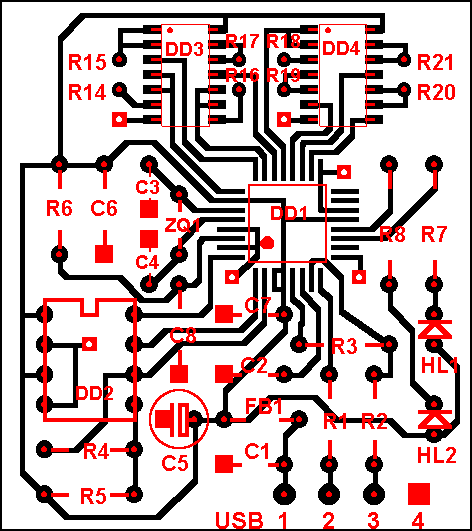 Преобразователь интерфейса смонтирован на двухсторонней печатной плате размером 40x45мм. Вы можете загрузить чертеж этой платы usbrs232.lay (40кб) в формате Sprint Layout 3.0. Фольга на второй стороне платы является общим проводом. Микросхема FT8U232BM выпускается только в 32-х выводном LQPF-корпусе с шагом 0,8мм для поверхностного монтажа. При ее распайке следует соблюдать особую аккуратность. DD3 и DD4 в корпусе SOIC, шаг выводов 1,27мм, DD2 в обычном DIP корпусе. DD1, DD3, DD4 устанавливаются со стороны монтажа, все остальные элементы монтируются традиционным способом. Резисторы R9...R21 распаиваются между выводами разъема DB9M и платой навесным монтажом. Как показала практика, если при работе через реальный COM порт можно использовать практически любую терминальную программу, то при работе через виртуальный порт к выбору терминала следует отнестись более внимательно. Дело в том, что, например самый популярный Гипертерминал из Windows-98 при пересылке файлов загружает процессор на 100%. Самое интересное, что загрузка практически не зависит от частоты компьютера. Чтобы убедиться в этом достаточно запустить "Системный монитор". А ведь драйверы USB тоже требуют ресурсов процесссора. В результате скорость обмена резко падает. Я протестировал несколько терминальных программ под Windows-98 и вот какие получил результаты. На последнем месте Гипертерминал, он пересылает файл объемом 75кб при скорости 57600 бод за 80 секунд. На пересылку этого же файла программе требуется чуть более 20 сек. И только простенький справляется с этой задачей за расчетные 15сек. При работе через реальный COM порт все эти программы выполняют пересылку за 15сек, но ZOC загружает процессор примерно на 30...40%, а Tera Term Pro - всего на 10%. Вот что значит алгоритм и мастерство программиста! Полную информацию по микросхеме FT8U232BM, все необходимые утилиты и драйверы, а также много другой полезной технической и справочной информации можно найти на сайте компании . Советую посетить сайт официального дистрибьютора FTDI - , где также можно найти всю необходимую информацию на русском языке и, самое главное, приобрести по вполне разумной цене (около 6USD + почтовые расходы) микросхему FT8U232BM. Литература: