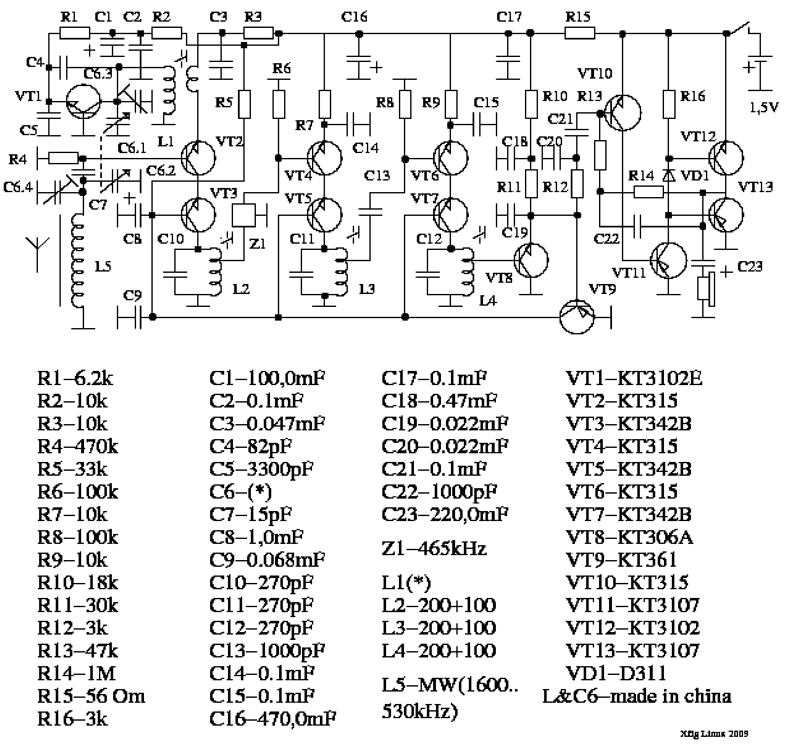 смеситель (VT2), ГПД (VT5), АРУ (VT6) и УНЧ (VT12...VT14).