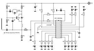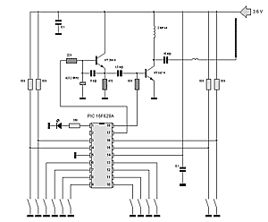 Шифратор – PIC 16F628A , он осуществляет обработку информации о нажатых кнопках кодирование и посылку пачек управляющих импульсов а также включение светодиодного индикатора и усилителя мощности во время передачи кода.
