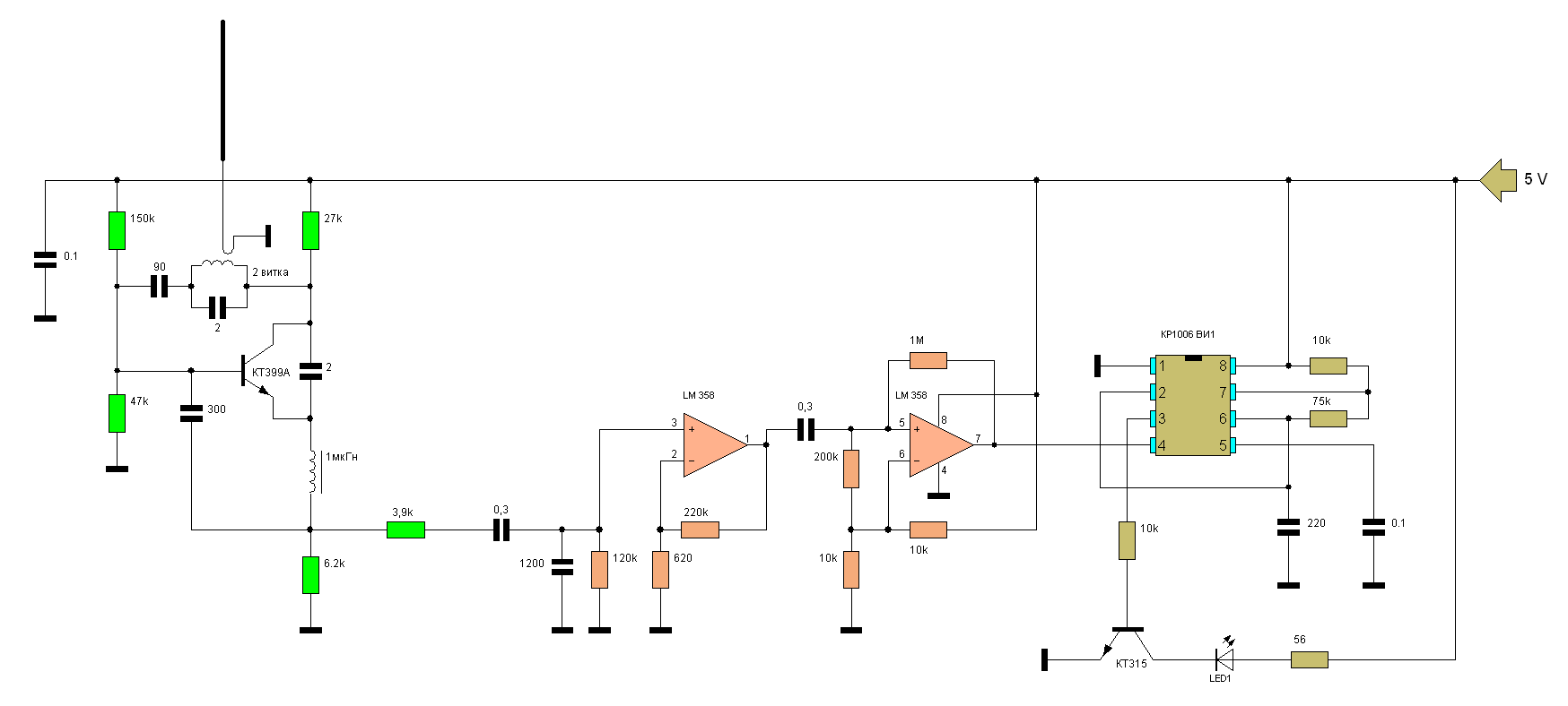 Его настройка сводится к подбору емкостей между коллектором и эмитером транзистора и емкости и индуктивности колебательного контура и катушки связи с антенной. Контролировать сигнал принятый приемником можно с выхода первого ОУ ( 1 нога LM 358 ) подключив туда вход контрольного УНЧ .